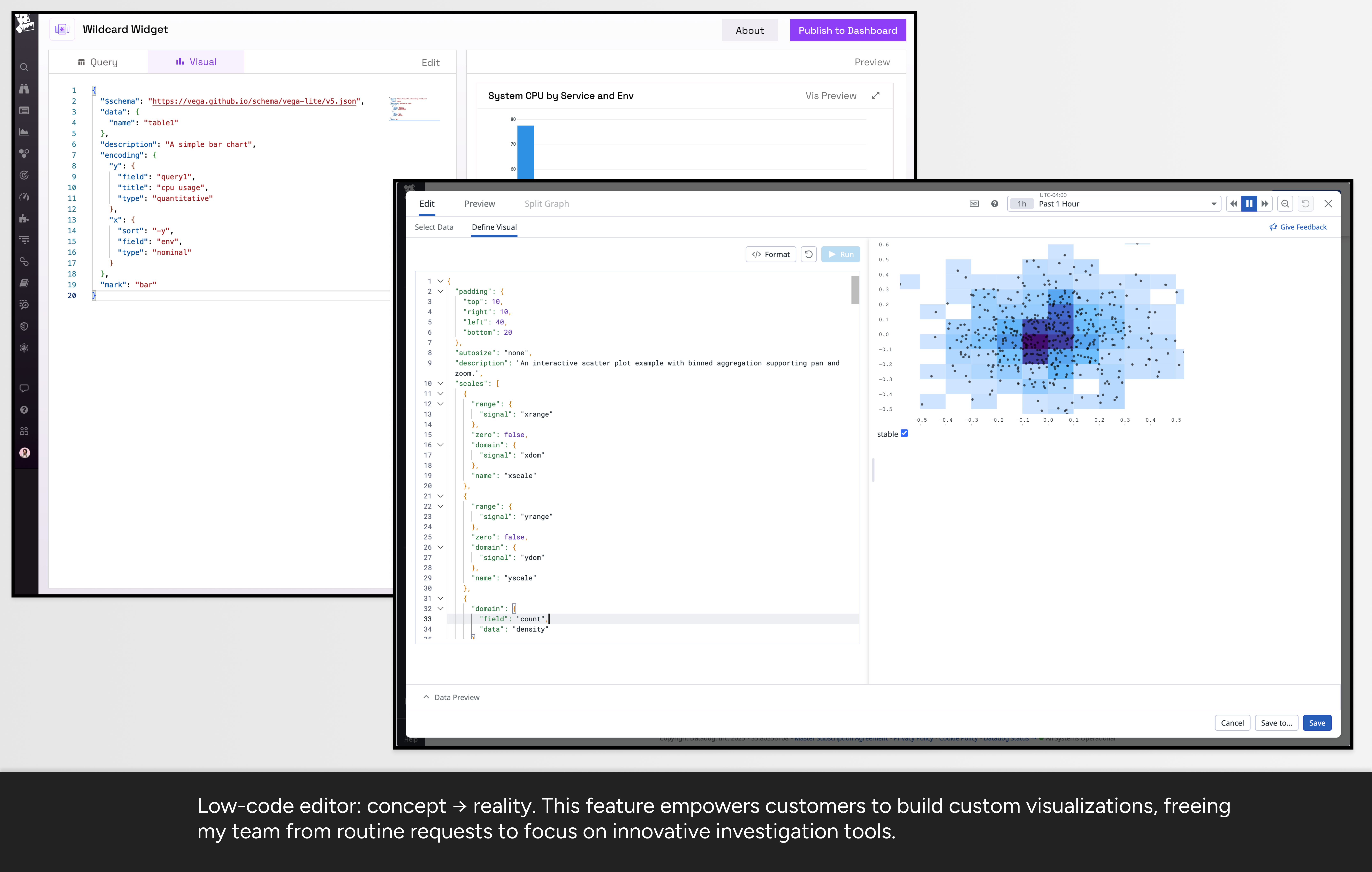 My initial scope was Data Visualization and Querying, where I created more powerful and expressive data analysis tools. I rebuilt the Datadog graph editor to center investigation workflows, shipped a low-code visualization interface that lets customers build any chart on their own, and introduced advanced querying with joins and transformations so customers can contextualize their data. The result: customers are able to answer questions not just about their software systems, but about their business. This keeps customers in Datadog instead of subscribing to other tools.